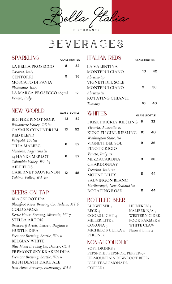 Welcome to Bella Italia Ristorante, a charming Italian haven located at 1390 U.S. Hwy 2 E in Kalispell, Montana. This delightful eatery showcases a range of authentic dishes that capture the essence of Italian cuisine. The menu is thoughtfully curated, featuring standout options like the sumptuous Veal Marsala and classic Mama's Lasagna, each steeped in tradition and flavor.